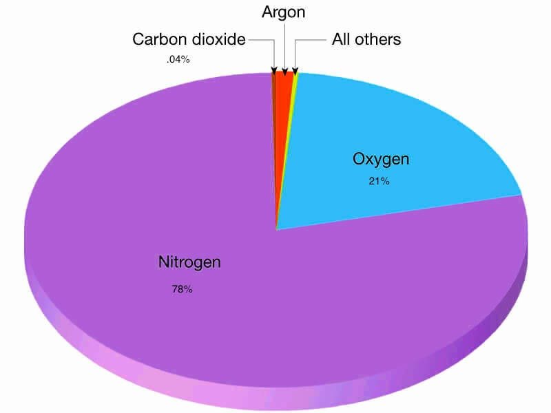 - Oxygen (21%): It is chemically very active, combining readily with other elements in the process of oxidation. Free oxygen in the atmosphere is a product of plant photosynthesis.