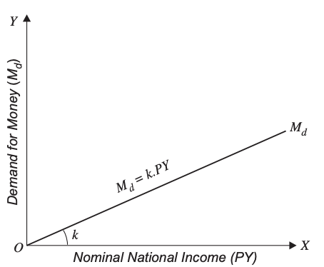 The demand for money is expressed as Md = kPY, where k is the proportion of nominal income people wish to hold as cash, P is price level, and Y is real income.