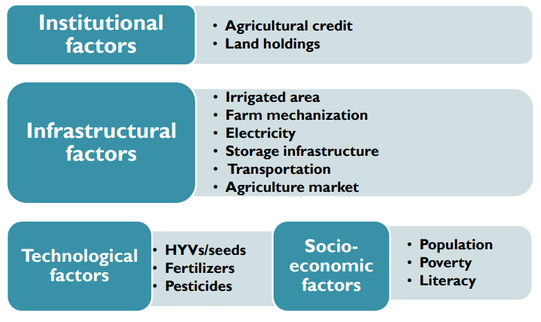 - Infrastructural factors: Irrigation, electricity, roads, credit and marketing, storage, facilities, crop insurance, and research.