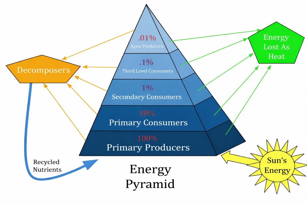 - Due to the way that energy is utilized as it is transferred between levels, the total biomass of organisms on each trophic level decreases from the bottom-up. Only around 10% of energy consumed is converted into biomass, whereas the rest is lost as heat, as well as to movement and other biological functions. Because of this gradual loss of energy, the biomass of each trophic level is often viewed as a pyramid, called a trophic pyramid.