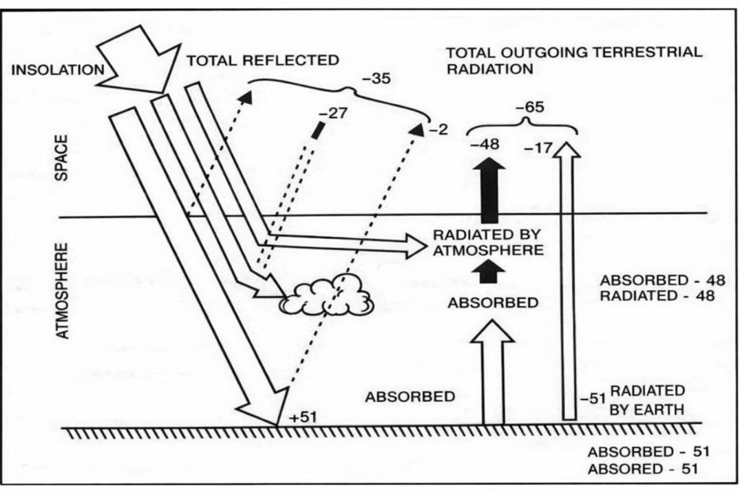- The total radiant solar energy that strikes the outer surface of the atmosphere, only half (approximately 51%) is able to reach the earth’s surface directly or indirectly and is absorbed by the earth. But not every part receives the same energy.
