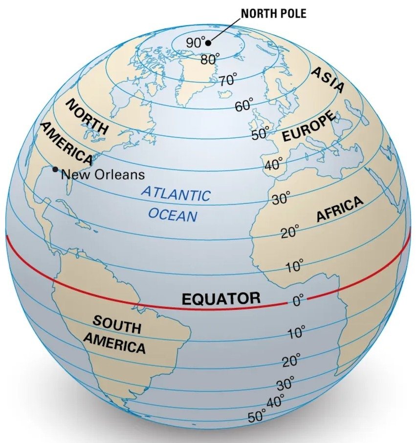 Latitudes are called parallels, totaling 180 degrees. Each degree spans roughly 69 miles (110 kilometers). The five major parallels, from north to south, include: