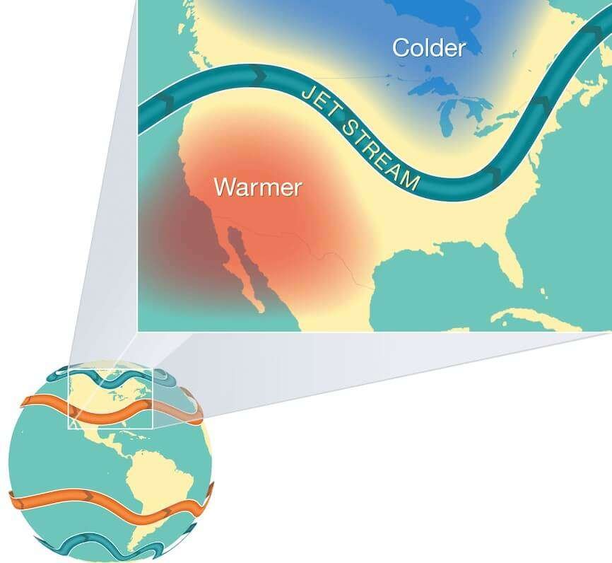 - Jet streams blow from west to east, but the flow frequently shifts to the north and south.
