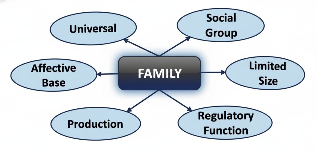 The family enjoys a unique and central position in society, and according to McIver and Page it is universal, emotionally based, limited in size, occupies a nuclear position in social structure, assigns responsibilities to members, and regulates social behaviour through early value formation.